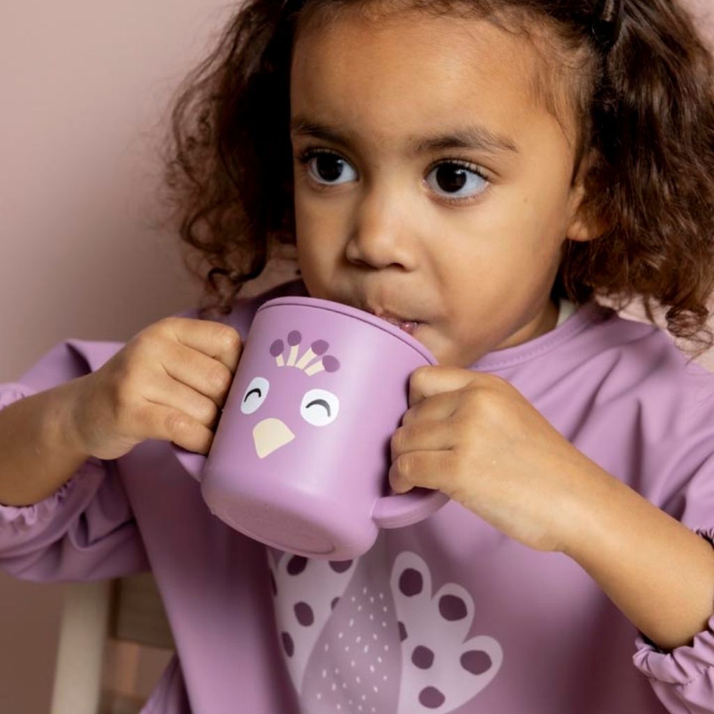 Dit slabbetje is niet alleen een praktische oplossing om de kleertjes van je kindje schoon te houden, het is ook een vrolijke toevoeging aan de eettafel, dankzij het leuke Mrs. Peacock design. De lange mouwen bieden extra bescherming, terwijl het opvangzakje aan de voorkant het gemorste eten netjes opvangt. Zo blijft etenstijd leuk en beperk je het schoonmaken tot een minimum.