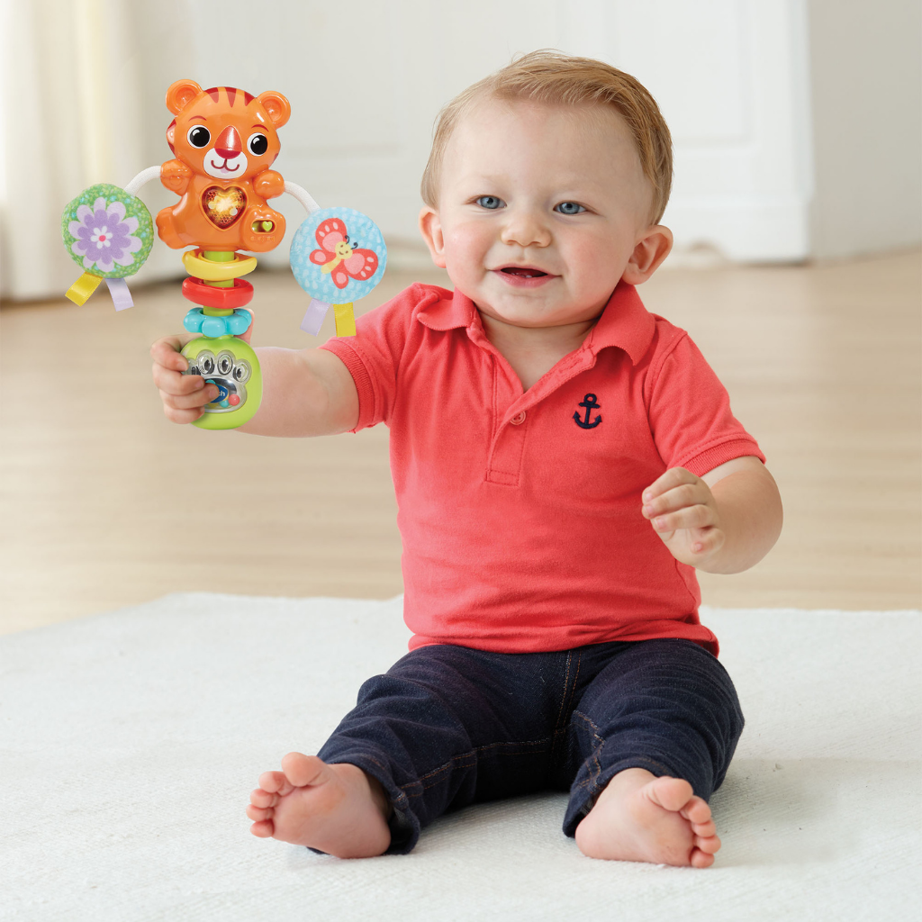 - Je kindje leert meer over het verband tussen oorzaak & gevolg: als je baby met de rammelaar schudt, begint die te bewegen en geeft hij licht.